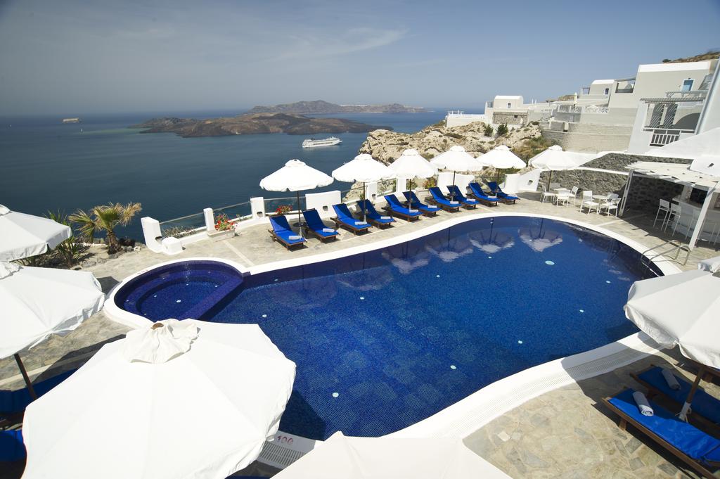 볼케이노 뷰 호텔은 산토리니에서 가장 큰 규모의 호텔로 95개의 객실과 프라이빗 풀을 갖춘 5개의 VIP럭셔리 빌라(Celestia Grand)를 보유하고 있습니다. 또한, 높은 수준의 서비스와 어메니티로 유명합니다. 널찍한 공용 수영장 3개와 전 객실 전통 키클라딕 건축 스타일과 밝고 깔끔한 데코레이션으로 만족도가 매우 높은 호텔입니다.