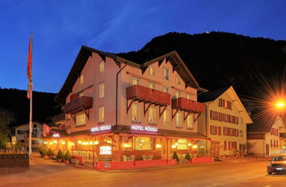 인터라켄 서역(west) 을 빠져나와 Unterseen / Beatenberg 방향으로 Bahnhofstrasse 거리를 따라 걸어옵니다. Turn right at the first crossroads (Bäckerei Michel). Hotel Rössli is about 80 metres further on, on the left.